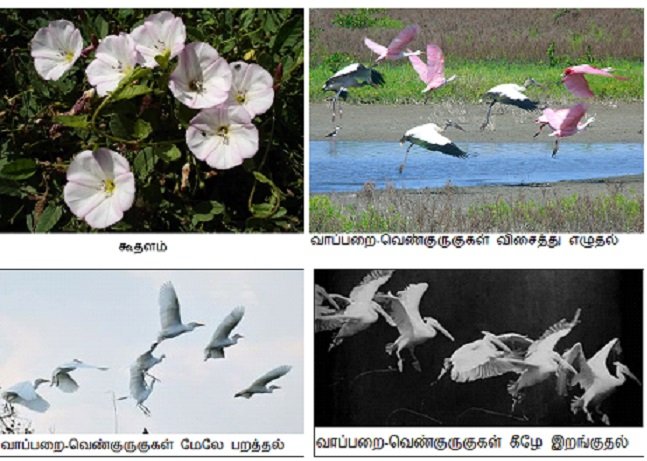 இங்கு கொடுக்கப்பட்டுள்ள படங்கள் புலவரின் வருணனையை ஓரளவு விளக்கும் வண்ணம் அமைந்துள்ளன. இவை வெவ்வேறு சூழ்நிலையில் எடுக்கப்பட்ட படங்களாயினும், விசைத்து எறியப்பட்ட ஒரு கூதள மாலையைப் போல் எழுந்து, பறந்து, பின்னர் அமரும் காட்சியை ஓரளவு விளக்கிக்காட்டுகின்றன.