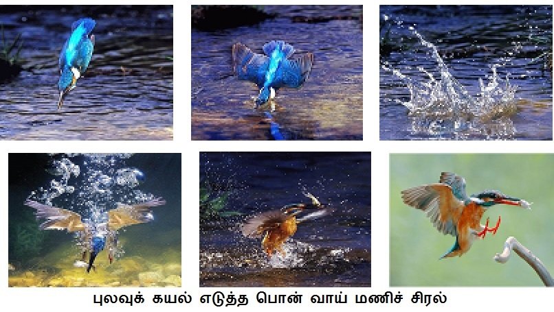ஒரு குளத்தங்கரை மரத்தில் அமர்ந்திருக்கும் ஒரு மீன்கொத்திப்பறவை, தக்க நேரம் பார்த்து ஒரு மீனைப் பாய்ந்து பிடிப்பதுவும், அதனால் விளைந்த விளைவுகளும் எட்டு அடிகளில் ஒரு காணொளிக்காட்சியாக (video) நம் கண் முன் விளக்கமாக வருணிக்கப்படுகிறது.