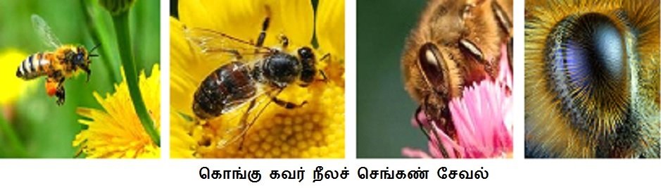 தேனீக்களின் கண்கள் பெரும்பாலும் நீலமும் ஓரளவு சிவப்பும் கலந்த நிறத்தவை. எனவே, இத்தொடரில், ‘நீல’, ‘செம்’ ஆகிய இரண்டையுமே கண்ணுக்கு அடைகளாகக் கொண்டு, சிவப்புக் கலந்த நீல நிறமுடைய கண்கள் என்று பொருள் கொள்வதே பொருத்தம் எனத் தோன்றுகிறது. எனினும், தேனீக்களின் கண்களைக் கூட இத்தனை உன்னிப்பாகக் கவனித்து அதற்கேற்ற சொற்களைப் பயன்படுத்தியுள்ள புலவரின் கூர்த்த மதி எண்ணி எண்ணி வியத்தற்குரியது. அதைப் போலவே ‘பொன் வாய் மணிச் சிரல்’ – அதாவது ‘பொன்னிற வாயை யுடைய நீலமணி போன்ற சிச்சிலியின்’ என்ற புலவரின் கூற்றும் எவ்வளவு உண்மை என்பதைப் படத்தில் பாருங்கள். எனவே, சங்கப் புலவர்களின் சொல்லோவியங்கள் ‘கறுப்பு-வெள்ளை’ (Black and White)ப் படங்களாக இல்லாமல், வண்ணப் படங்களாகவே இருப்பதை இங்குக் காண்கிறோம்.